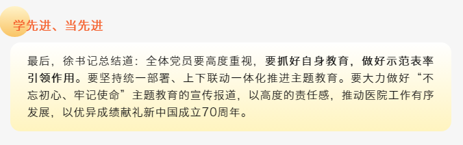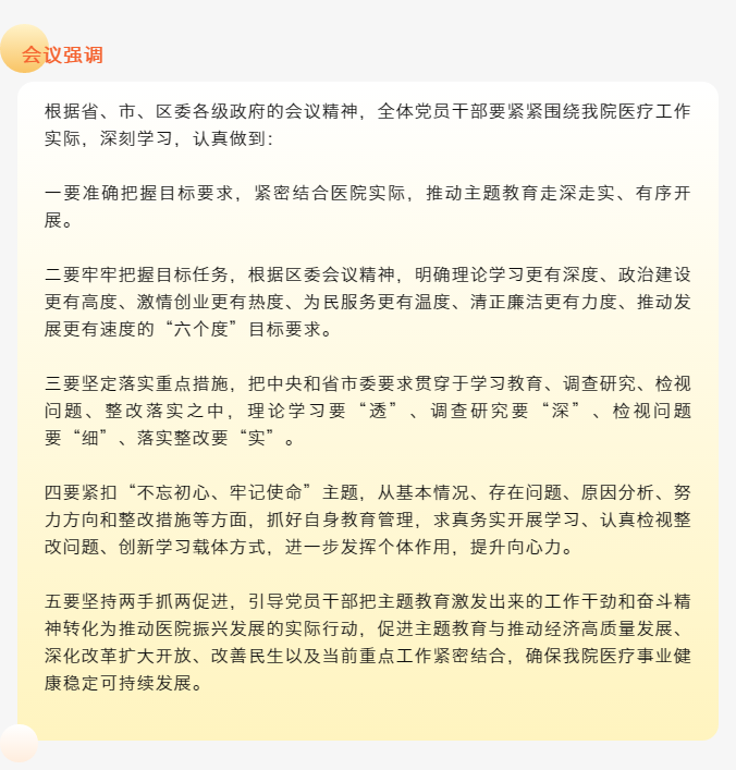徐珂瓊書(shū)記首先指出:開(kāi)展主題教育,是提升發(fā)展動(dòng)力,完成新時(shí)代歷史使命的必然要求,是增強(qiáng)發(fā)展能力,推動(dòng)醫(yī)院高質(zhì)量發(fā)展的迫切需要,是凝聚發(fā)展合力,踐行以人民健康為中心的發(fā)展理念的重要舉措。全體黨員干部要深刻領(lǐng)會(huì)開(kāi)展主題教育的重大意義,切實(shí)提高政治站位,增強(qiáng)開(kāi)展主題教育的思想自覺(jué)、政治自覺(jué)和行動(dòng)自覺(jué),確保取得扎扎實(shí)實(shí)的成效。