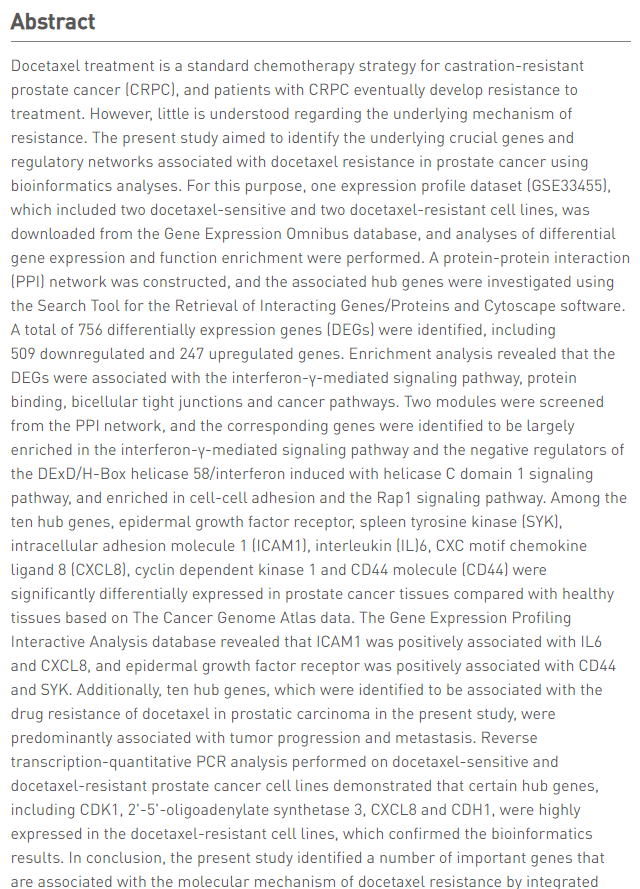 由我院顧霄鵬醫(yī)師參與撰寫的醫(yī)學(xué)論文《Identification and characterization of biomarkers and their functions for docetaxel?resistant prostate cancer cells》在SCI期刊Oncology Letters上發(fā)表。
