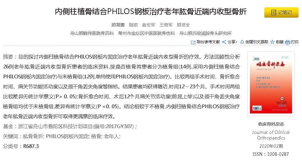 由我院掌門人顧岳全、顧霄鵬、王奇軍、翁宏軍等撰寫的論文《內(nèi)側(cè)柱植骨結(jié)合PHILOS鋼板治療老年肱骨近端內(nèi)收型骨折》在《臨床骨科雜志》2020年第二期上發(fā)表。