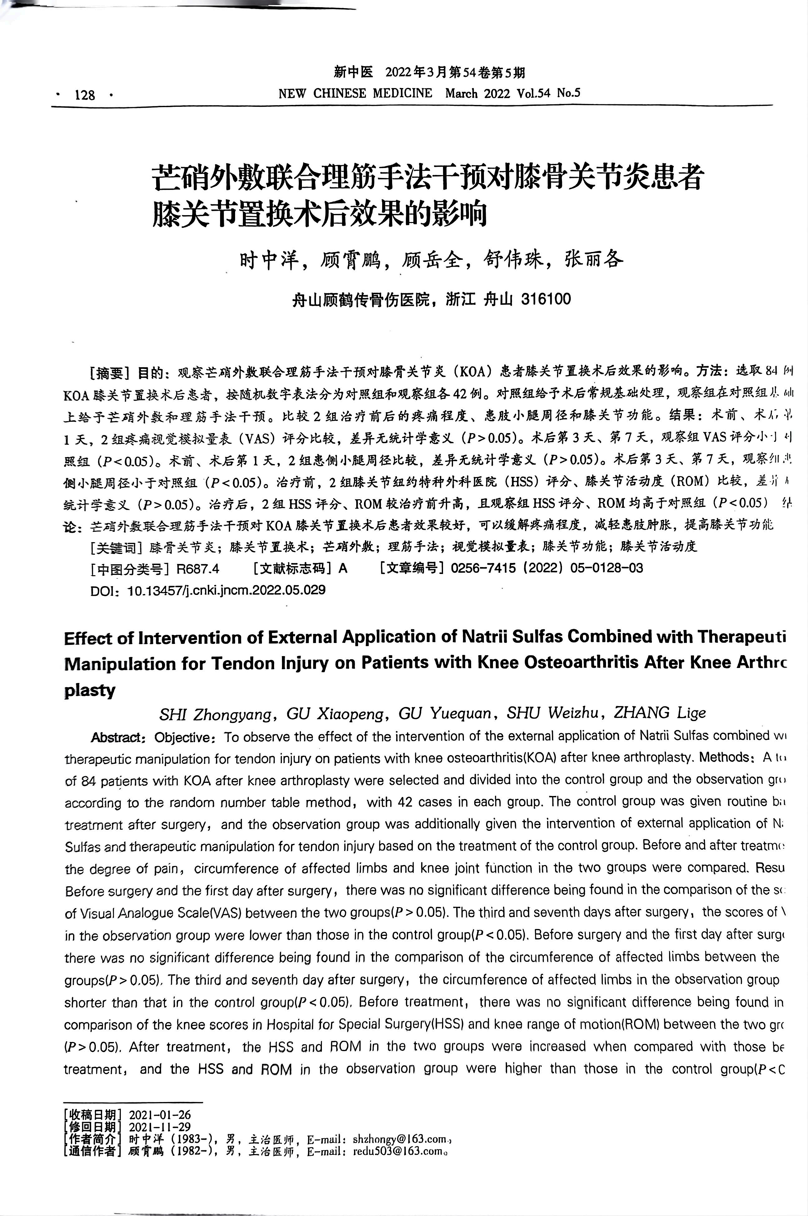 由我院時(shí)中洋、顧霄鵬、顧岳全、舒?zhèn)ブ榈柔t(yī)師參與撰寫(xiě)的醫(yī)學(xué)論文《芒硝外敷聯(lián)合理筋手法干預(yù)對(duì)膝骨關(guān)節(jié)炎患者膝關(guān)節(jié)置換術(shù)后效果的影響》在中華中醫(yī)藥學(xué)會(huì)系列雜志《新中醫(yī)》2022年3月第54卷第5期上發(fā)表。