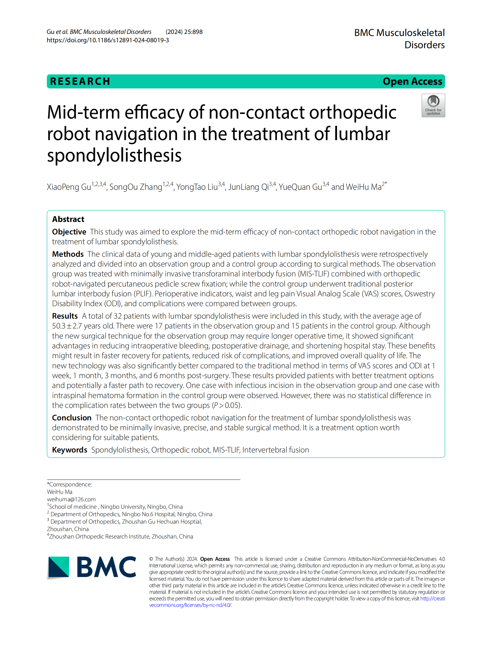 由我院顧霄鵬、張宋歐、劉永濤等醫(yī)師參與撰寫的醫(yī)學(xué)論文《Mid-term efficacy of non-contact orthopedic robot navigation in the treatment of lumbar spondylolisthesis》于2024年11月9日在SCI期刊Front Pharmacol上發(fā)表。