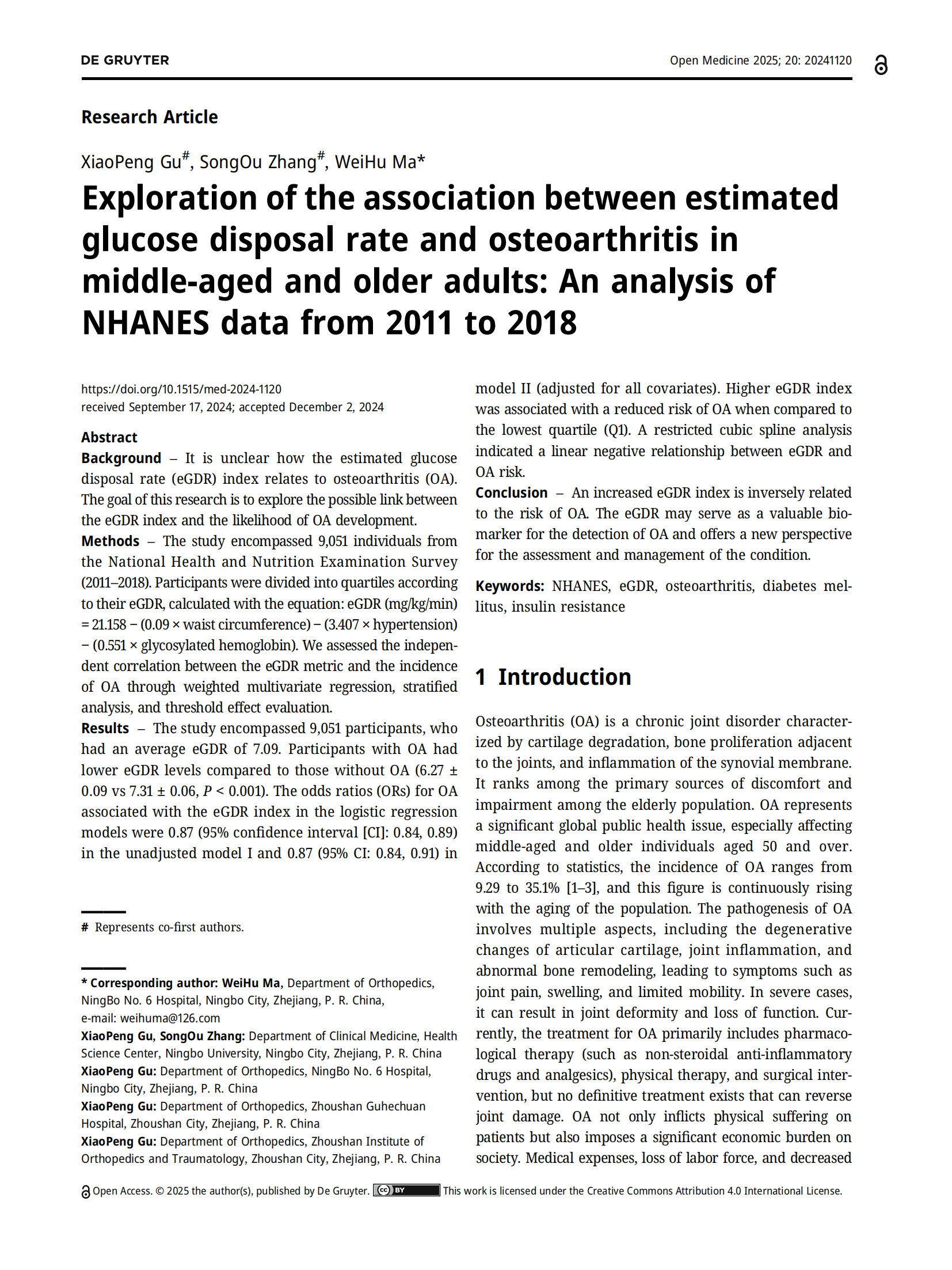 由我院顧霄鵬、張宋歐等醫(yī)師參與撰寫的醫(yī)學(xué)論文《Exploration of the association between estimated glucose disposal rate and osteoarthritis in middle-aged and older adults: An analysis of NHANES data from 2011 to 2018》2025年2月4日SCI期刊Open Med (Wars)上發(fā)表。