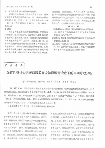 由我院掌門人顧岳全、顧霄鵬、舒?zhèn)ブ?、王奇軍等撰寫的論文《?qiáng)直性脊柱炎患者口服柔脊安神風(fēng)濕膏治療下的中期療效分析》在《舟山醫(yī)學(xué)》2019年47卷第2期上發(fā)表。