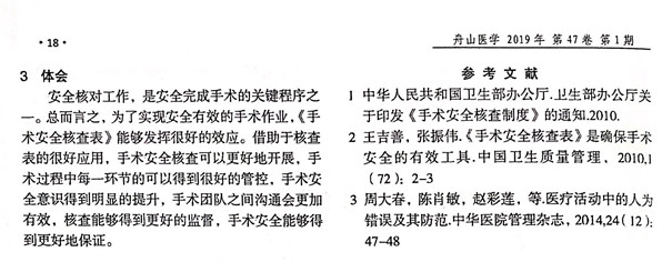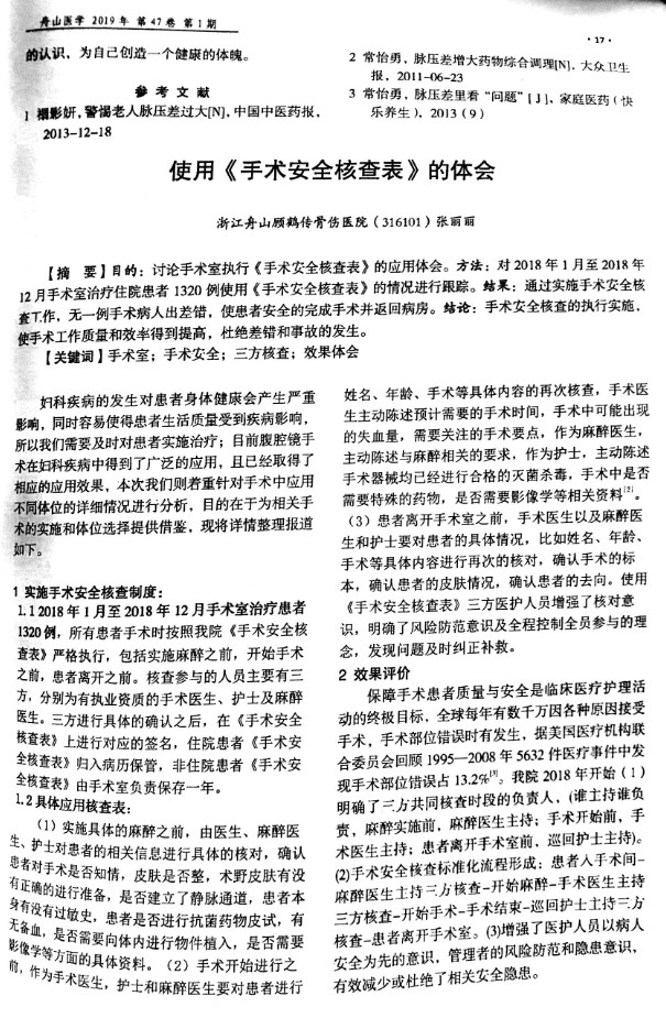 由我院張麗麗護(hù)士長(zhǎng)撰寫的論文《使用<手術(shù)安全核查表>的體會(huì)》在《舟山醫(yī)學(xué)》2019年47卷第1期上發(fā)表。