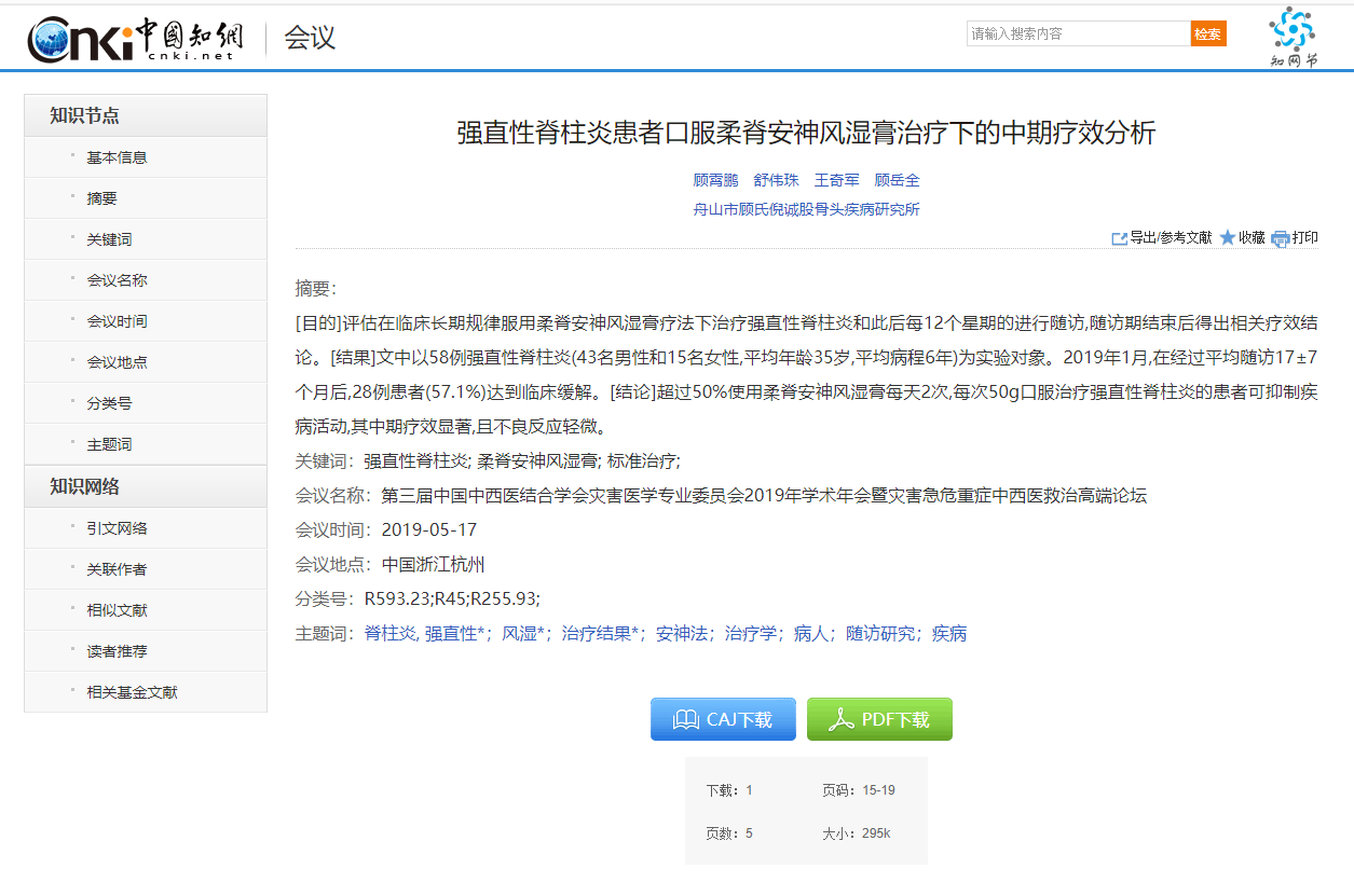 由我院掌門人顧岳全、顧霄鵬、舒?zhèn)ブ?、王奇軍等撰寫的論文《?qiáng)直性脊柱炎患者口服柔脊安神風(fēng)濕膏治療下的中期療效分析》被收錄于第三屆中國中西醫(yī)結(jié)合學(xué)會(huì)災(zāi)害醫(yī)學(xué)專業(yè)委員會(huì)2019年學(xué)術(shù)年會(huì)暨災(zāi)害急危重癥中西醫(yī)救治高端論壇會(huì)議論文庫。