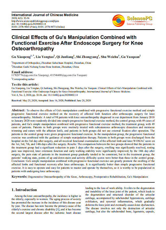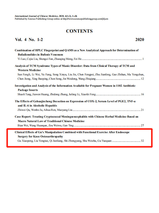 由我院顧霄鵬、劉永濤、戚軍良、時中洋、舒?zhèn)ブ?、顧岳全撰寫的論文《Clinical Effects of Gu's Manipulation Combined with Functional Exercise After Endoscope Surgery for Knee Osteoarthropathy 》在《International Journal of Chinese Medicine》上發(fā)表。