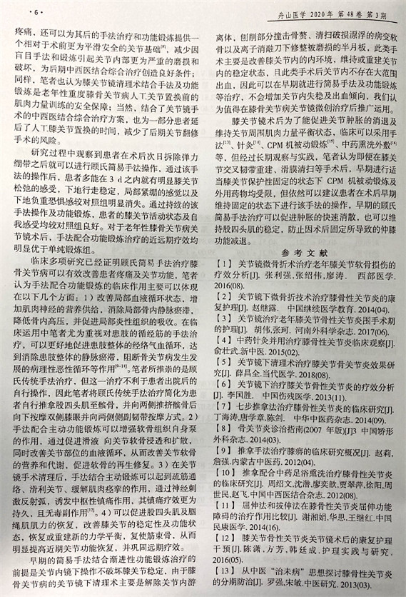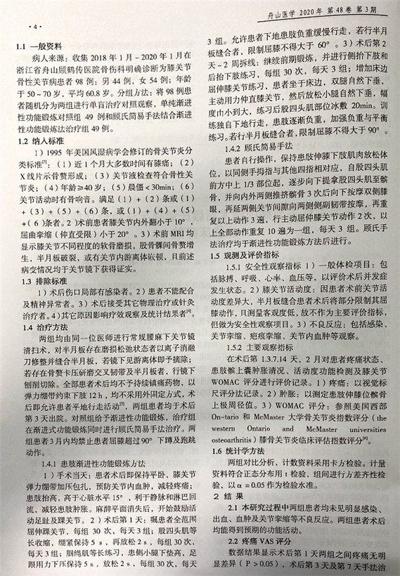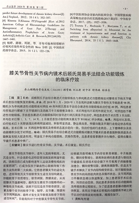 由我院顧霄鵬、劉永濤、戚軍良、時中洋、舒?zhèn)ブ?、顧岳全等醫(yī)師撰寫的論文《膝關(guān)節(jié)骨性關(guān)節(jié)病內(nèi)鏡術(shù)后顧氏簡易手法結(jié)合功能鍛煉的臨床療效》在舟山醫(yī)學(xué)雜志上發(fā)表。